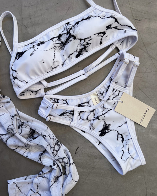 SET BIKINI MARMOL BLANCO + FALDA EN MALLA
